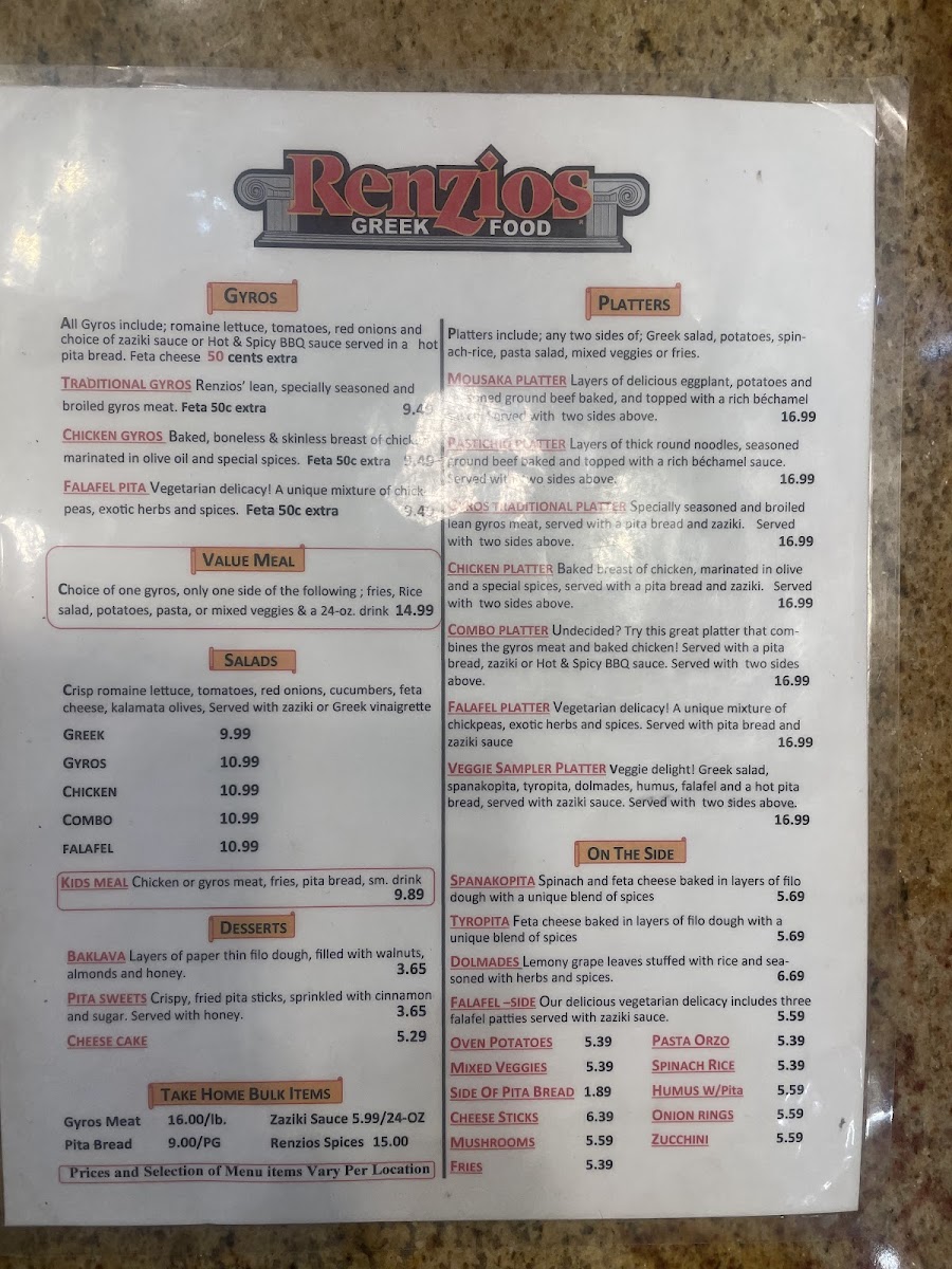 When you step into Renzios Greek Food, you're in for an authentic culinary experience. Nestled in the heart of Denver at 3000 E 1st Ave, this spot invites you to explore traditional Greek flavors with a warm, welcoming atmosphere. The Renzios Greek Food Menu offers a delightful selection of Mediterranean dishes, crafted with fresh ingredients that reflect the heart and soul of Greece. From the rich, aromatic souvlaki to the perfectly grilled lamb chops, every dish tells a story. Whether you're in the mood for a light appetizer like hummus or a hearty moussaka, there’s something for everyone to enjoy. Each bite feels like a step closer to Greece, making it a go-to for food lovers seeking bold, vibrant flavors.